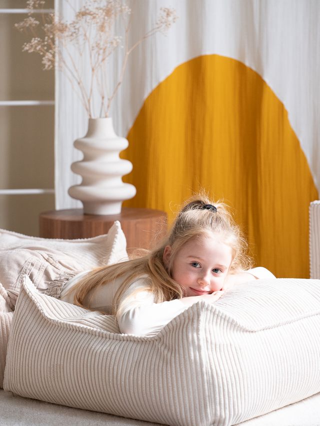 Die Wigiwama Quadratische Ottomane in Weiß ist die ideale Ergänzung zum Sitzsack und schafft eine helle, gemütliche Atmosphäre im Kinderzimmer oder Spielbereich. Ob als Fußbank, zusätzlicher Sitzplatz oder Spielfläche – das schlichte, skandinavische Design fügt sich harmonisch in moderne Interieurs ein.