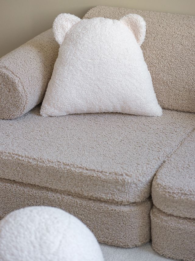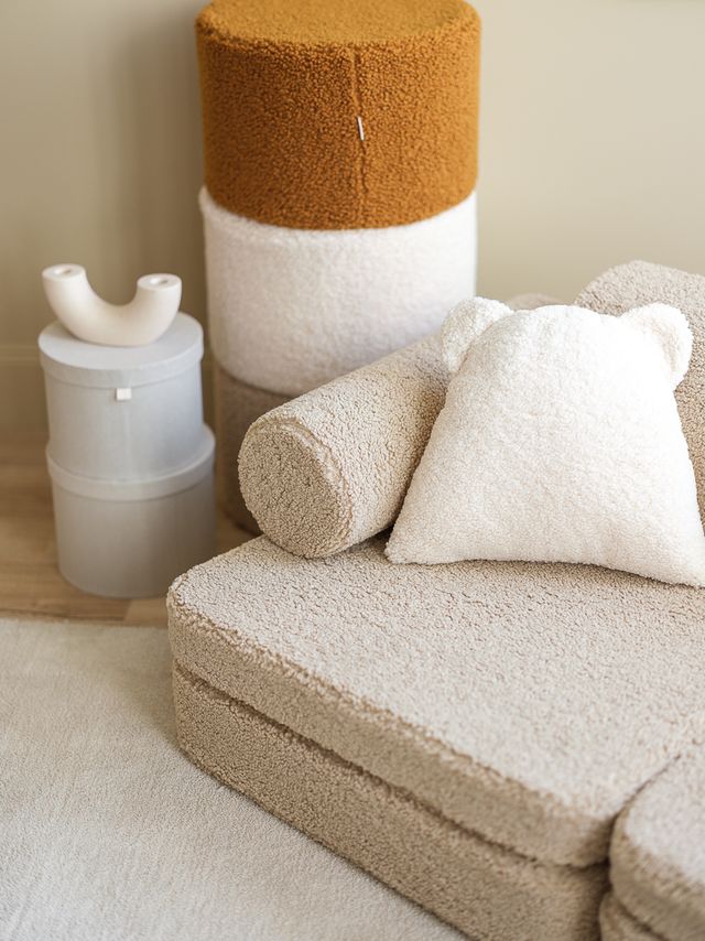 Der Bezug aus OEKO-TEX®-zertifiziertem Teddystoff (100 % Polyester) sorgt für eine besonders weiche Oberfläche, während die Füllung aus ISO-zertifiziertem Polyurethanschaum stabilen, langlebigen Komfort bietet. Das zeitlose skandinavische Design fügt sich mühelos in moderne Wohn- und Kinderzimmer ein.