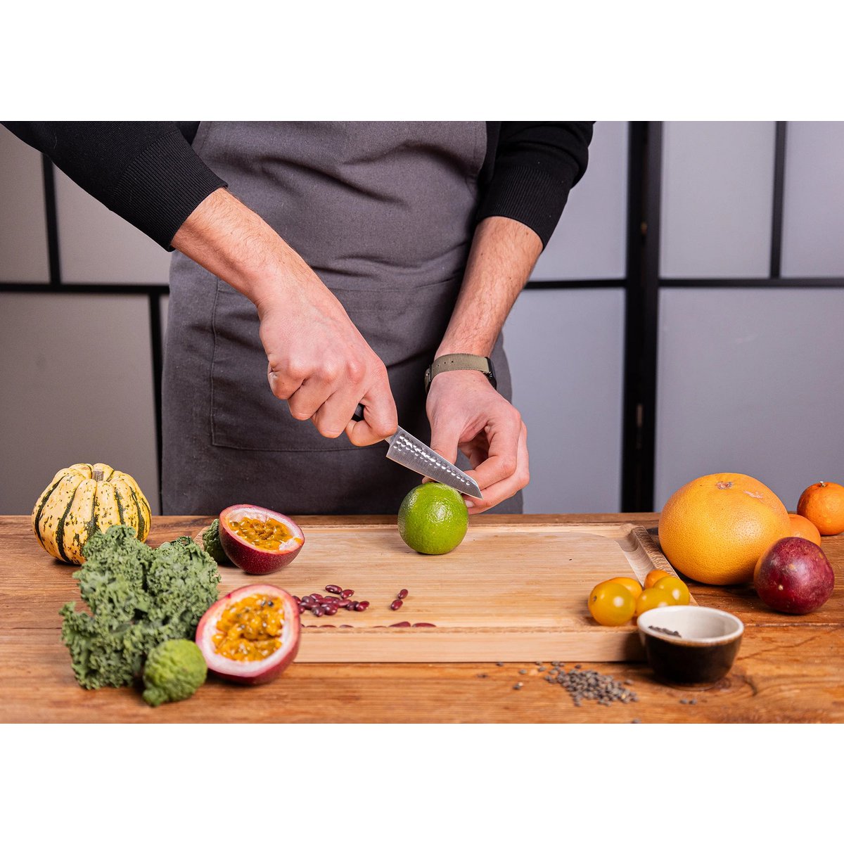 Neben seinem ästhetischen Reiz erzeugt das „Tsuchime“ (槌目) (gehämmerte) Muster winzige Lufteinschlüsse zwischen der Klinge und dem zu schneidenden Lebensmittel. Diese uralte japanische Methode reduziert den Luftwiderstand und verhindert so, dass Lebensmittel an der Klinge haften bleiben.