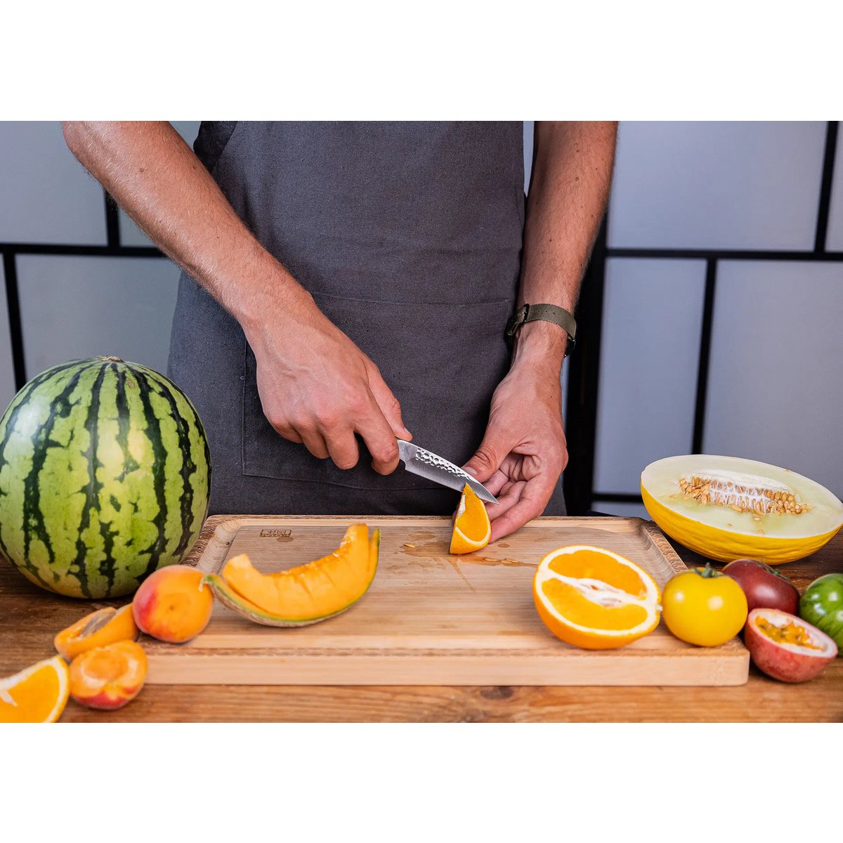 Neben seinem ästhetischen Reiz erzeugt das „Tsuchime“ (槌目) (gehämmerte) Muster winzige Lufteinschlüsse zwischen der Klinge und dem zu schneidenden Lebensmittel. Diese uralte japanische Methode reduziert den Luftwiderstand und verhindert so, dass Lebensmittel an der Klinge haften bleiben.
