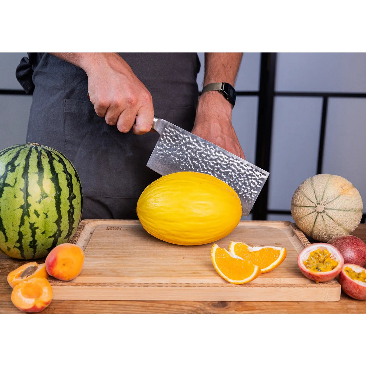 Neben seinem ästhetischen Reiz erzeugt das „Tsuchime“ (槌目) (gehämmerte) Muster winzige Lufteinschlüsse zwischen der Klinge und dem zu schneidenden Lebensmittel. Diese uralte japanische Methode reduziert den Luftwiderstand und verhindert so, dass Lebensmittel an der Klinge haften bleiben.