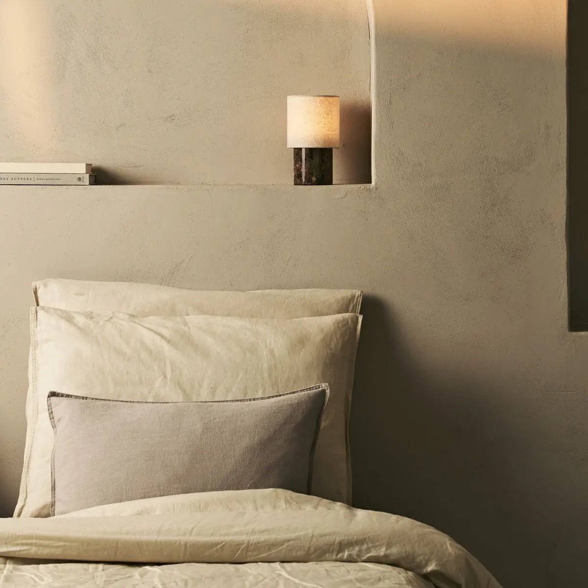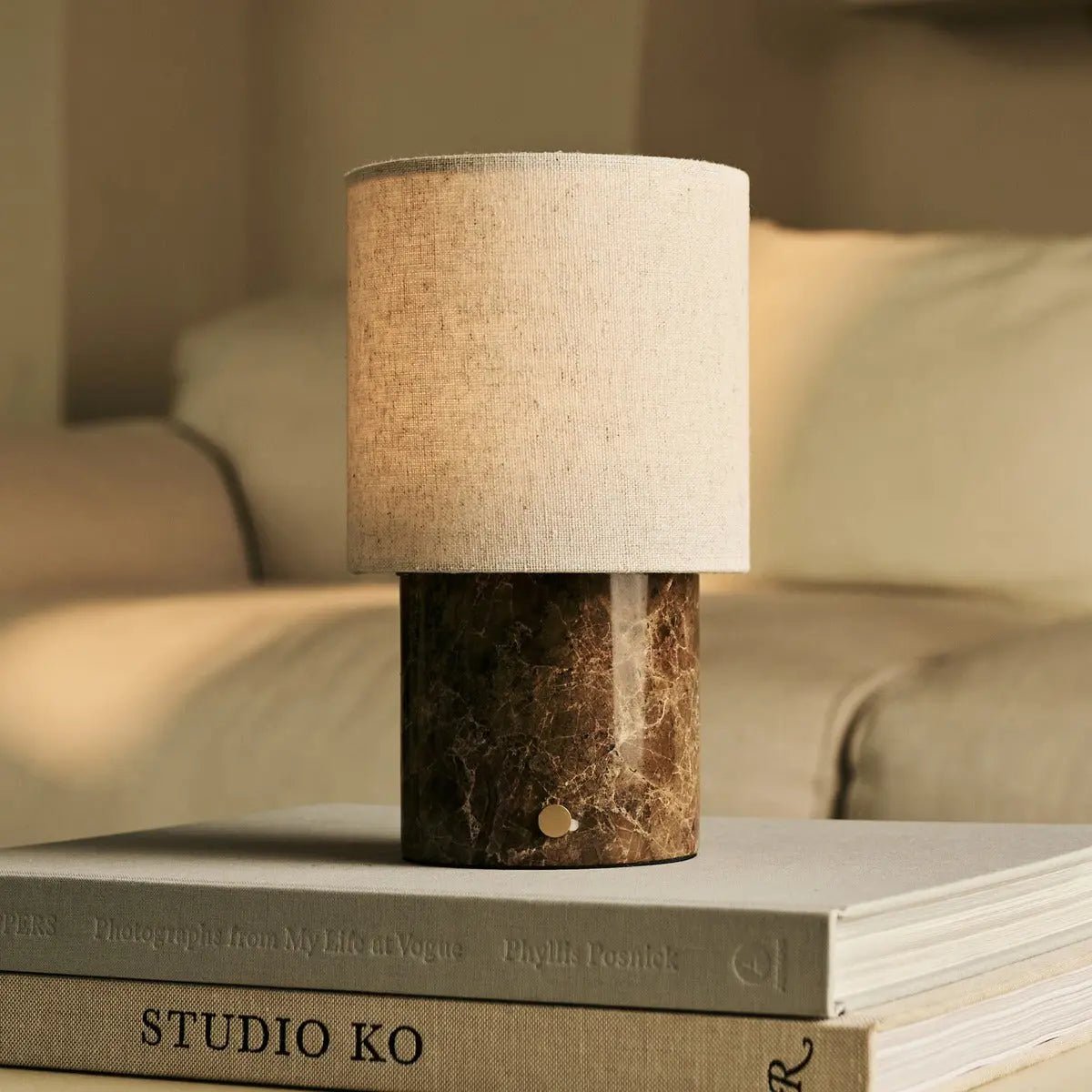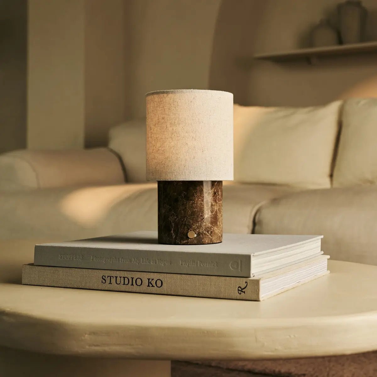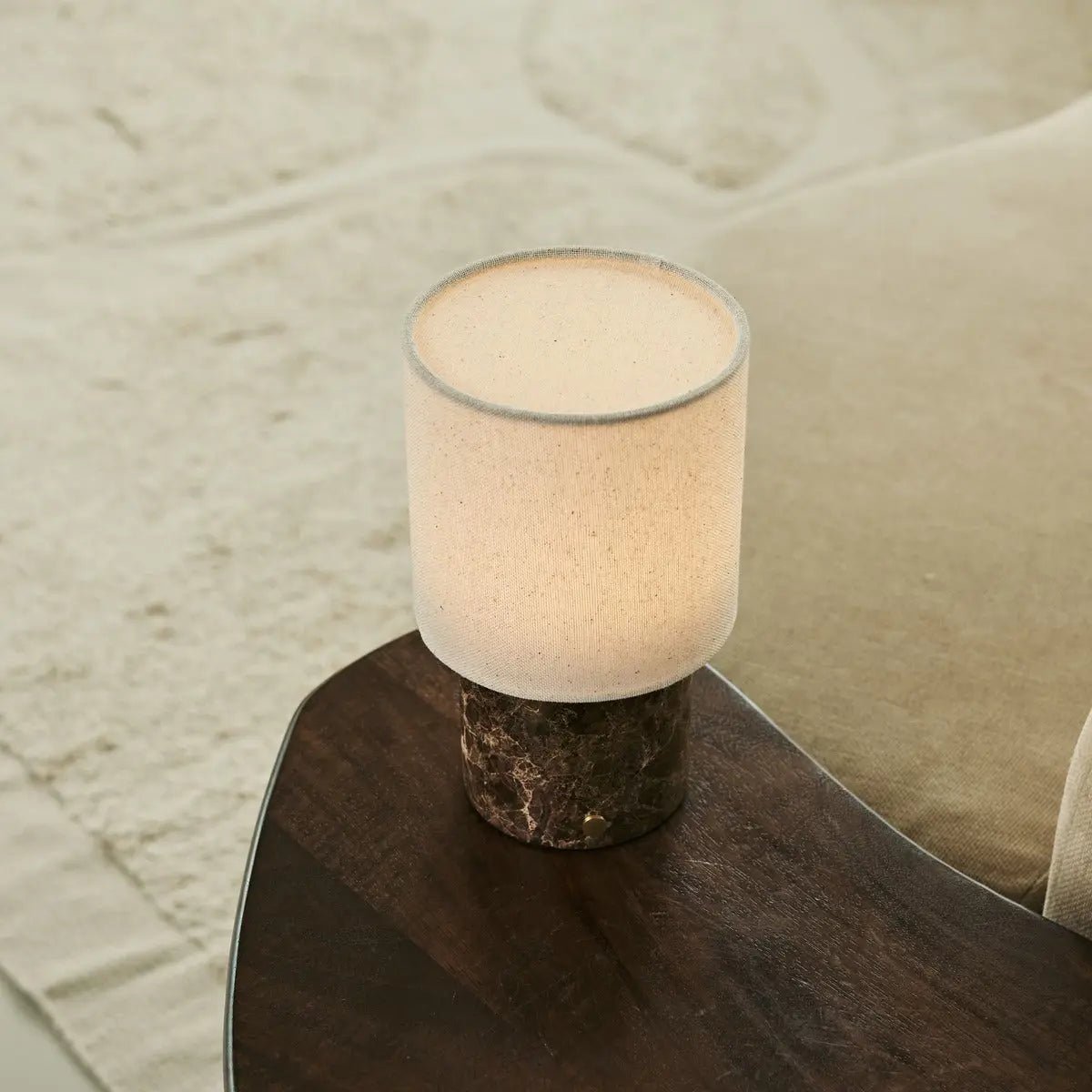 Die Onoda kombiniert klassische Marmorästhetik mit modernem Komfort. Das Zusammenspiel von braunem Marmor und Leinen erzeugt ein weiches, warmes Licht, das jeden Raum aufwertet.