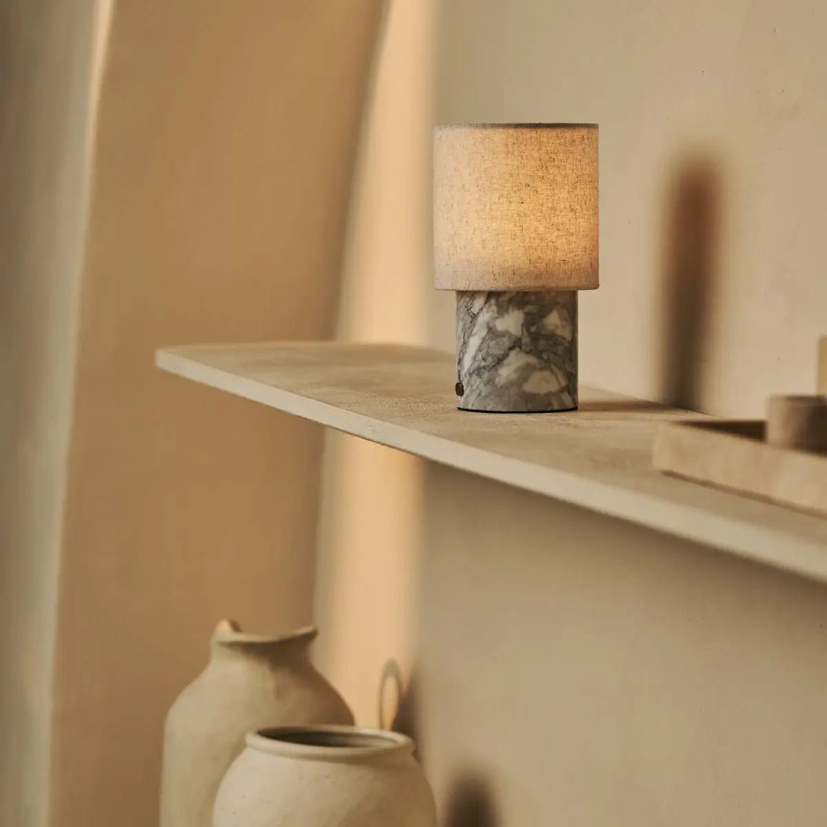 Die Kombination aus weißem Marmor und Leinenschirm verleiht der Onoda ein elegantes Erscheinungsbild, das sowohl in modernen als auch klassischen Räumen perfekt zur Geltung kommt.