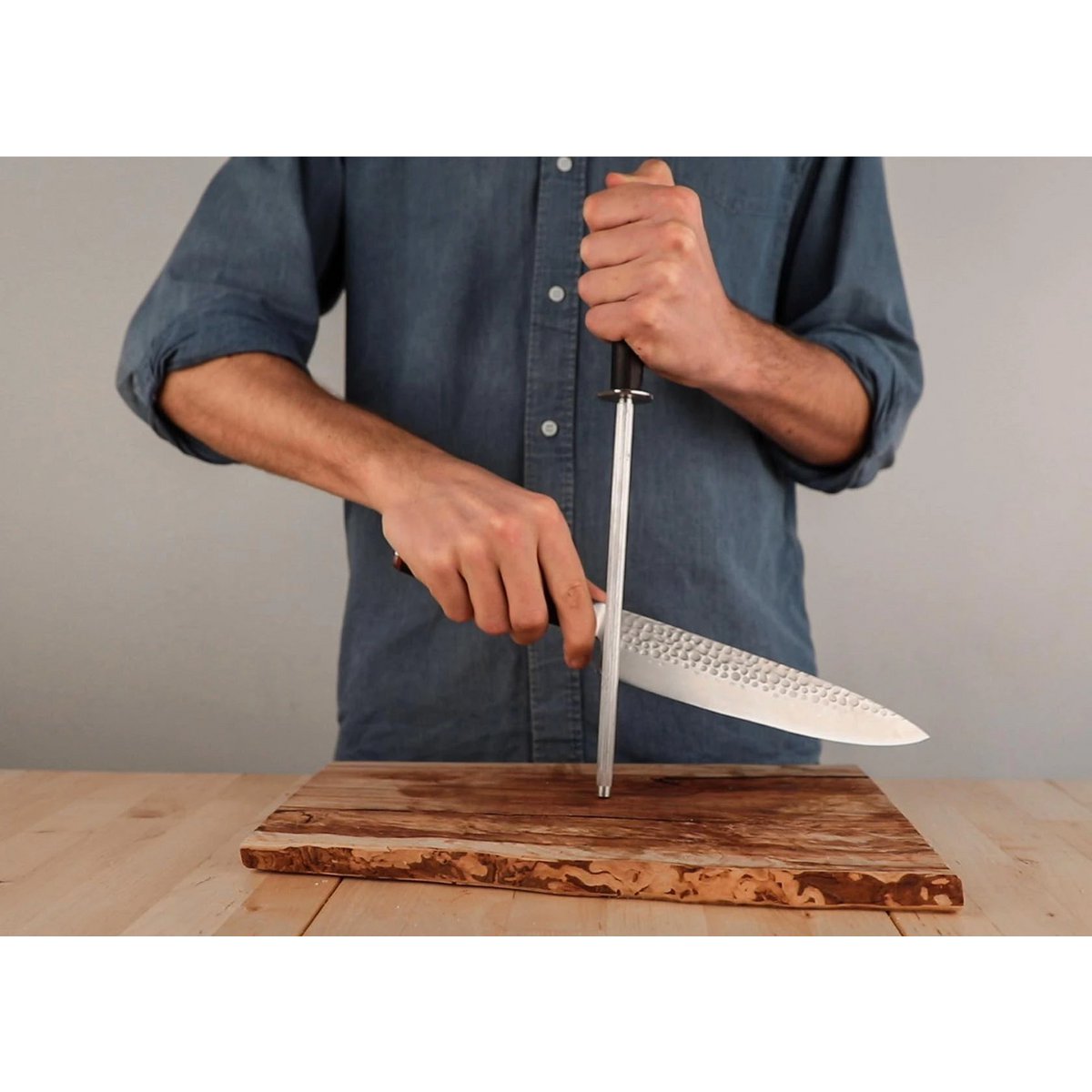 Neben seinem ästhetischen Reiz erzeugt das „Tsuchime“ (槌目) (gehämmerte) Muster winzige Lufteinschlüsse zwischen der Klinge und dem zu schneidenden Lebensmittel. Diese uralte japanische Methode reduziert den Luftwiderstand und verhindert so, dass Lebensmittel an der Klinge haften bleiben.