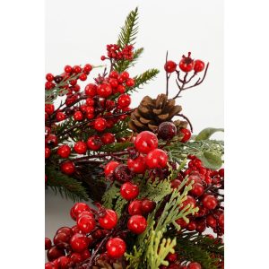 Er ist mit grünen Tannenzweigen, Tannenzapfen und Blaubeeren geschmückt und verfügt über 15 warmweiße LED-Leuchten, die für eine gemütliche, weihnachtliche Atmosphäre sorgen.